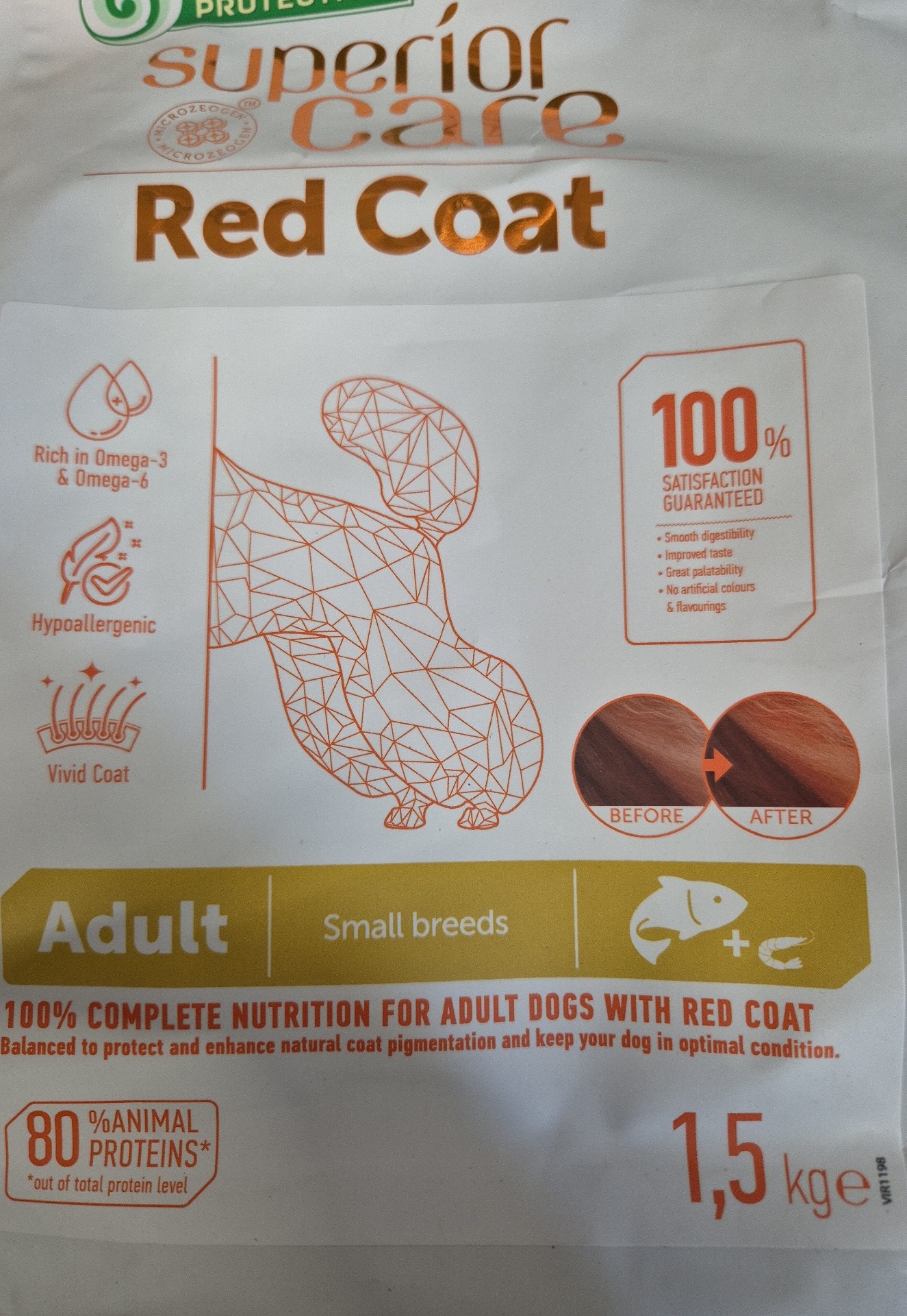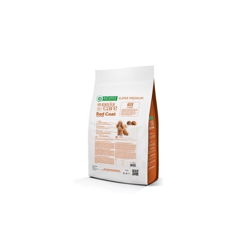Nature's Protection Red Coat Grain Free with Salmon for Adult Small Breed dogs è ben noto per il suo RCE Complex (Red Coat Enhancer Balanced Amino Acid Complex), una composizione bilanciata che aiuta a proteggere e migliorare la pigmentazione naturale dei manti marroni e rossi e mantenere i livelli chiari e la composizione della saliva.
